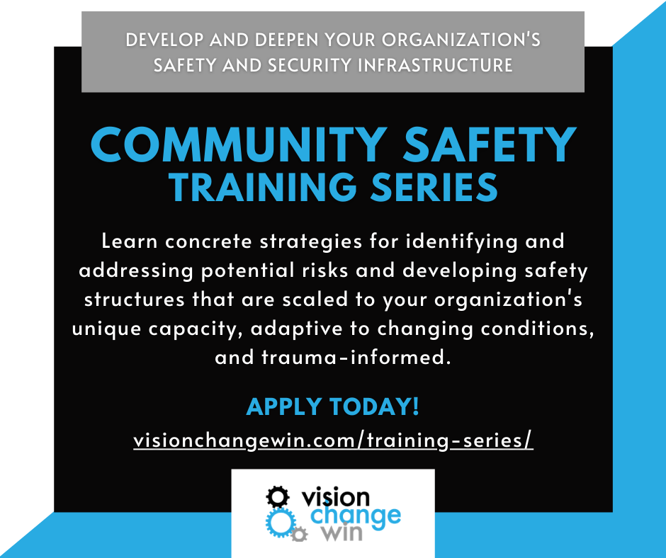 The training series is meant to provide a solid introductory foundation for community safety and security work. For more in-depth training and capacity-building, we recommend attending our Community Safety & Security School, which is a 9-month organizational cohort training and implementation program.